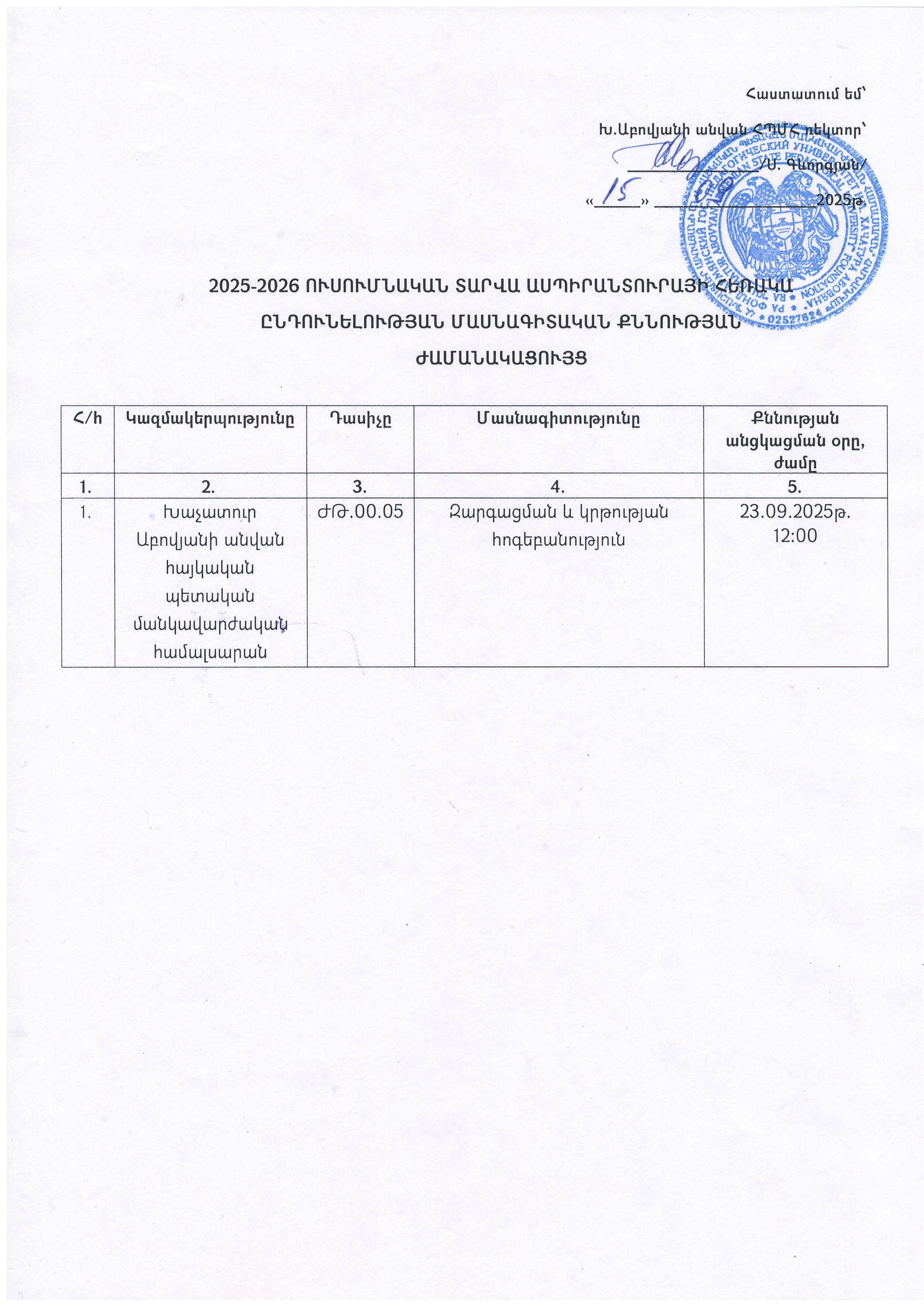 2025-2026 ուսումնական տարվա ասպիրանտուրայի հեռակա ընդունելության մասնագիտական քննության ժամանակացույց
