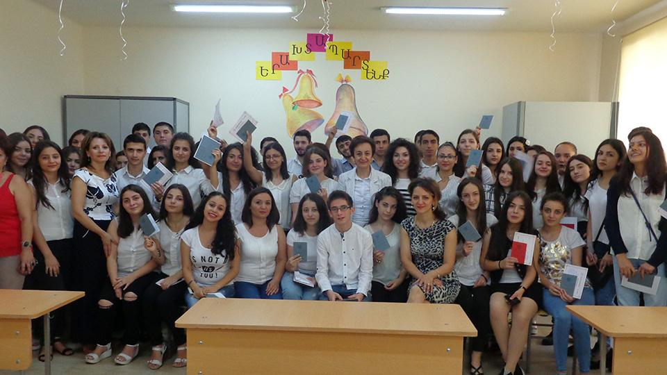 Վարժարանի տնօրեն Նաիրա Սաֆարյանը, հանդիսավորությամբ հանձնելով ատեստատները, կարևորեց նախ լավ մարդ մնալու հանգամանքը, ապա նկատեց, որ որ կյանքի նոր փուլում պետք է տեսակը չկորցնել և քայլել առաջ։