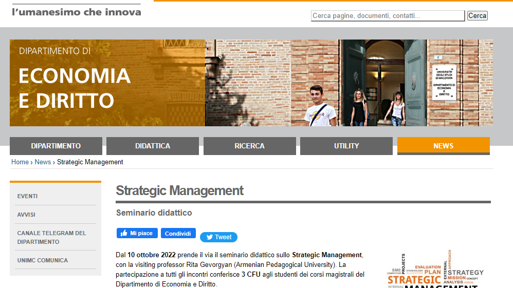 Ի դեպ, նախքան ծրագրի մեկնարկը, Մաչերատայի համալսարանի Տնտեսագիտության և իրավունքի ֆակուլտետի դեկան Ելենա Չեդրոլայի հետ քննարկվել են դասընթացի կառուցման ու դասավանդման տեսական, մեթոդական կողմերը, որից հետո այն հաստատվել է ֆակուլտետի նիստում։