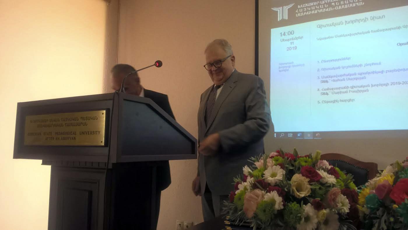 Մանկավարժական համալսարանի այս ուսումնական տարվա առաջին գիտական խորհրդի նիստի սկզբում, ավանդույթի համաձայն, ռեկտոր Ռուբեն Միրզախանյանը շնորհավորեց համալսարանի աշխատակից հոբելյարներին՝ Գևորգ Կարապետյանին, Սվետլանա Ադամովային, Սահակ Տրոյանին, Ծովինար Շահիրյանին, Սամվել Աբաջյանին, Մհեր Մելիք-Բախշյանին, Լայմա Կունդրատսին, մաղթելով քաջառողություն և հաջողություններ հետագա գործունեության ընթացքում: