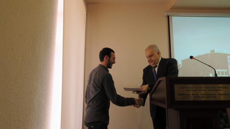 Ավանդույթի համաձայն՝ բուհի ռեկտոր Ռուբեն Միրզախանյանը շնորհավորեց ամսվա հոբելյարներին, ապա բուհի 2 ուսանողներին հանձնեց սփյուռքահայեր Հակոբ և Շամիր Ավագյանների նվիրատվությունը: