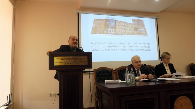 Կրթական գործընթացների կառավարման և բարեփոխումների վարչության պետ Մկրտիչ Ավագյանը Գիտական խորհրդին ներկայացրեց բուհի գործունեության ռազմավարական ծրագրով (2016-2020 թթ․) նախատեսված նախորդ տարվա անելիքները, ինչպես նաև դրա կատարման վերաբերյալ արդյունքները։