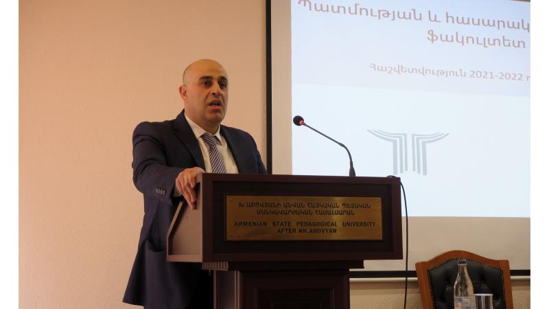 Վերջինս, ներկայացնելով ուսանողական խորհրդի գործունեությունը, անդրադարձավ ուսանողների համակողմանի զարգացմանն ուղղված սոցիալական բնույթի ծրագրերի իրականացմանը, ներկայացրեց սպորտային, մշակութային և հոգևոր բնույթի միջոցառումները։