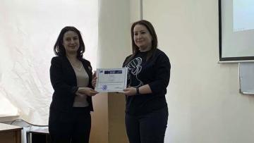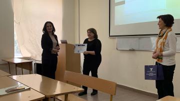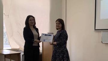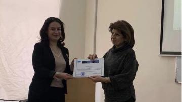 ՀՊՄՀ Աշխատակազմի և միջազգային համագործակցության գծով պրոռեկտոր Մարիաննա Հարությունյանը հավաստագրեր և խորհրդանշական նվերներ հանձնեց բուհի 100-ամյակին նվիրված դասապլանի մրցույթի հաղթողներին։