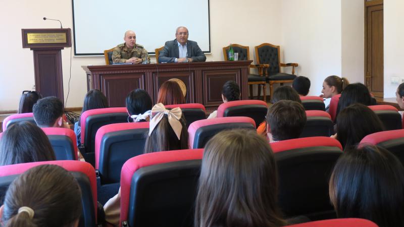 Ուսանողները ՀՀ ՊՆ զորակոչային և զորահավաքային համալրման ծառայության պետի ժամանակավոր պաշտոնակատարից հետաքրքվեցին զորահավաքային զորակոչի, զինվորական ծառայության վիճակահանության, հիվանդություններով պայմանավորված ծառայությունից ազատվելու, տարկետման իրավունքի, զորամասից այլ զորամաս տեղափոխվելու, խաղաղ և պատերազմական իրավիճակներում ծառայության տարբերությունների, զինվորական ծառայության մեջ ընդգրկված կանանց դերի, ռազմաբժշկական ծառայության մասին և այլն: