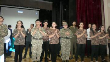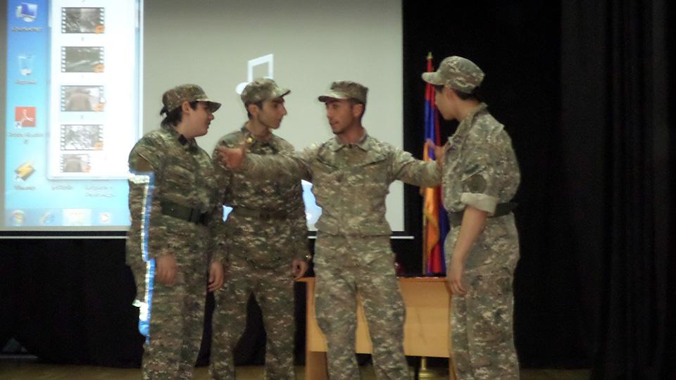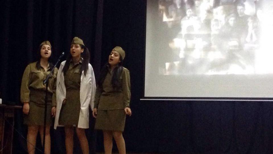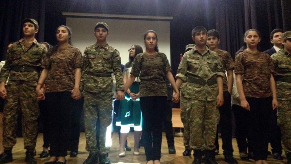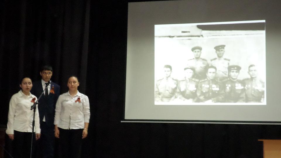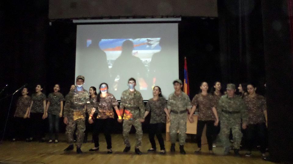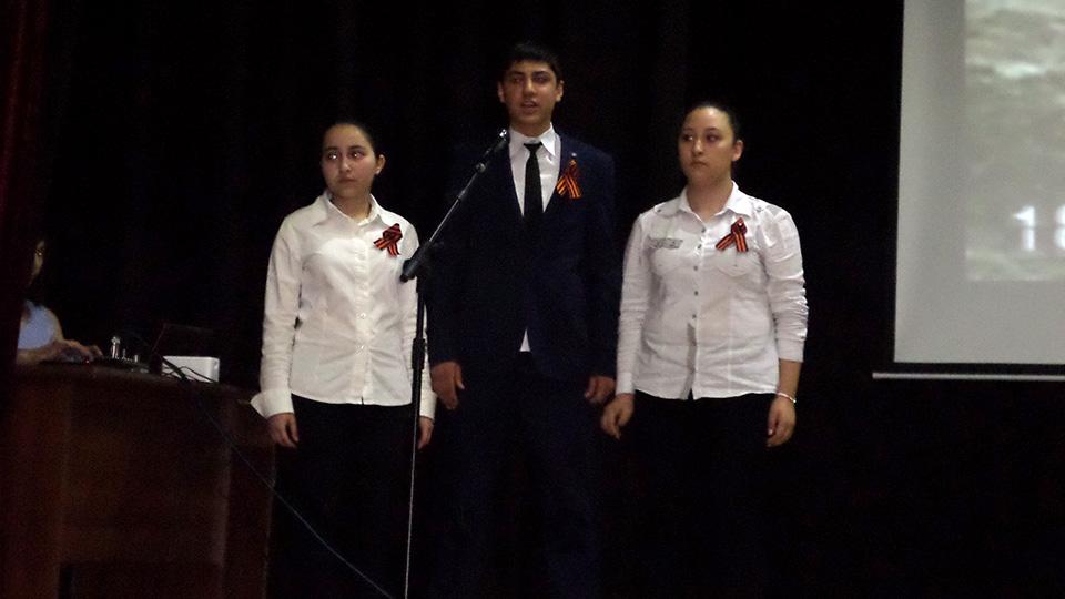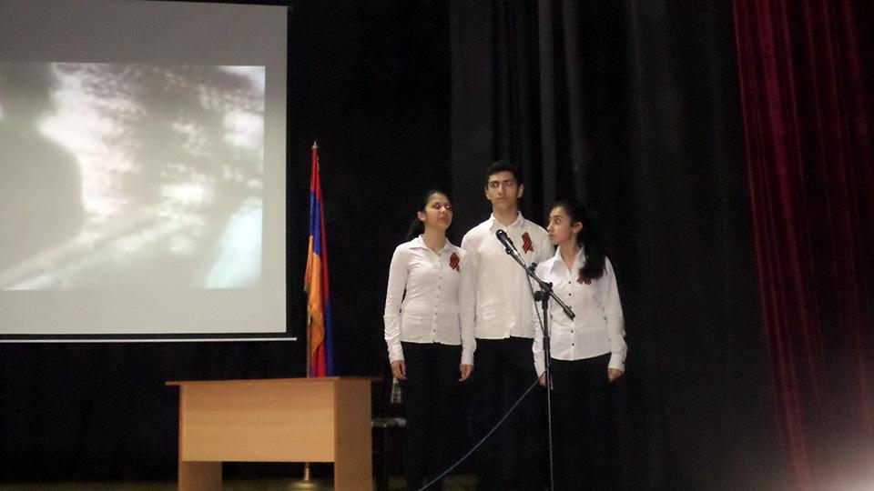 Ինչպես հատուկ է հայրենիքն անձնվիրաբար ծառայած հային՝ ավելի քան 600.000-ից մարդ մասնակցեց Մեծ հայրենականին, որոնցից 106-ն արժանացան ԽՍՀՄ հերոսի կոչման՝ աշակերտները մեծ հպարտությամբ ներկայացրին պատմական փաստն ու անդրադարձան մայիսյան հաղթանակներն ամբողջացնող եռատոնին՝ Շուշիի «մաքրման» գործողությանն ու մայիսի 9-ին հինավուրց հայկական բերդաքաղաքն ազատագրելուն.«Շահեցի՞ր երկիր, թե՞ կորցրեցիր.բարձունքը մերն է, տղեքը չկան…»: