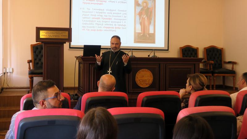 Համահայկական նշանակություն ունեցող իրադարձություններին ընդառաջ՝ այսօր Մանկավարժական համալսարանում «Մյուռոնի խորհուրդը» թեմայով դասախոսությամբ հանդես եկավ Մայր Աթոռ Սուրբ էջմիածնի միաբան, Տ․ Զաքարիա ծայրագույն վարդապետ Բաղումյանը։