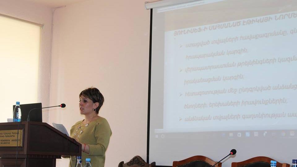 Կլոր սեղանի ընթացքում Սյունիքի մարզում «Ապագա մանկավարժների կրթության և գործող մասնագետների վերապատրաստման ուժեղացումը ներառական կրթության համատեքստում» ծրագրի շրջանակներում իրականացրած հետազոտության արդյունքների մասին վերլուծությամբ հանդես եկավ ՀՊՄՀ-ի սոցիոլոգիայի և սոցիալական աշխատանքի ամբիոնի դասախոս, ծրագրի սոցիոլոգ Նունե Գևորգյանը: