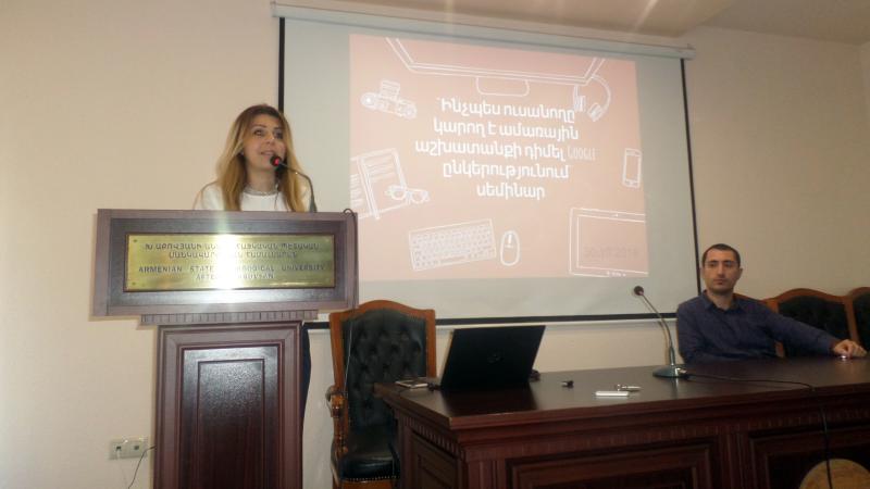 Կրթության էլեկտրոնային բաժնի ղեկավար Անուշ Սարգսյանը ուսանողներին ներկայացրեց Google ընկերություն դիմելու հայտի էլեկտրոնային տարբերակը և ծանոթացրեց դիմելու առանձնահատկություններին, իսկ համալսարան-գործատու համագործակցության կենտրոնի մասնագետ Հրայր Օհանյանը ընդհանրական տեղեկատվություն տրամադրեց գրագետ CV կազմելու վերաբերյալ։