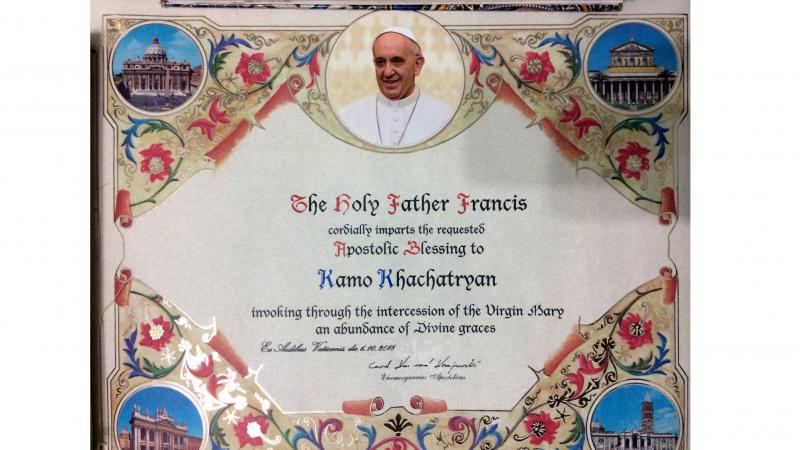 Օրերս Մանկավարժական համալսարանի դասախոս Կամո Խաչատրյանը Հռոմի Ֆրանցիսկոս պապի կողմից ստացել է օրհնությամբ գրված վկայական՝ ի պատիվ հայ վարպետի նվիրական գործունեության։